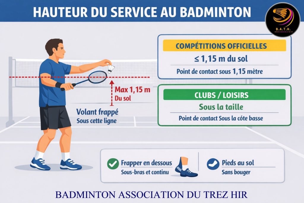 Voici la réglementation générale concernant la hauteur du service au badminton, surtout en compétition, basée sur les règles officielles du jeu :